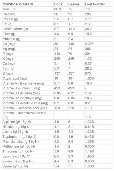 The values shown are for 100 grams of edible portions. The chart displays the purported nutritional value of the pods, fresh (raw) leaves and dried leaf powder.